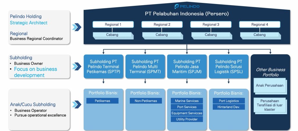 Pasca mergernya Pelindo I-IV pada tahun 2021 menjadi Pelindo, perusahaan melakukan transformasi struktur perusahaan dengan membentuk 4 subholding untuk menjalankan bisnis inti dari Pelindo. Pelindo juga membentu 4 kantor regional yang bertugas sebagai perwakilan Pelindo di 4 wilayah operasi. Kantor regional tidak lagi memiliki direct business exposure pasca pembentukan subholding, dan pencapaian target bisnis dan operasional regional sangat bergantung dengan pencapaian subholding sebagai business owner & operator.
